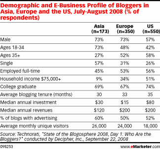 between blogging and the mainstream media have disappeared.” That’s just one of the juicy bits of data highlighted in an eMarketer article that hit my e-mail box today regarding the growing global blogosphere. While the new Technorati study is a bit skewed because the company’s user-base was surveyed, it still has some great insights.