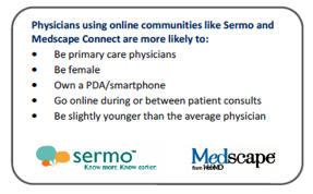 how many physicians are using online social networks like Sermo and Medscape’s Physician Connect. According to the research firm’s press release about the study “60% of physicians [are] already using or interested in using physician online communities.” In addition, the company reports that active or interested physician social networkers tend to prescribe more drugs.